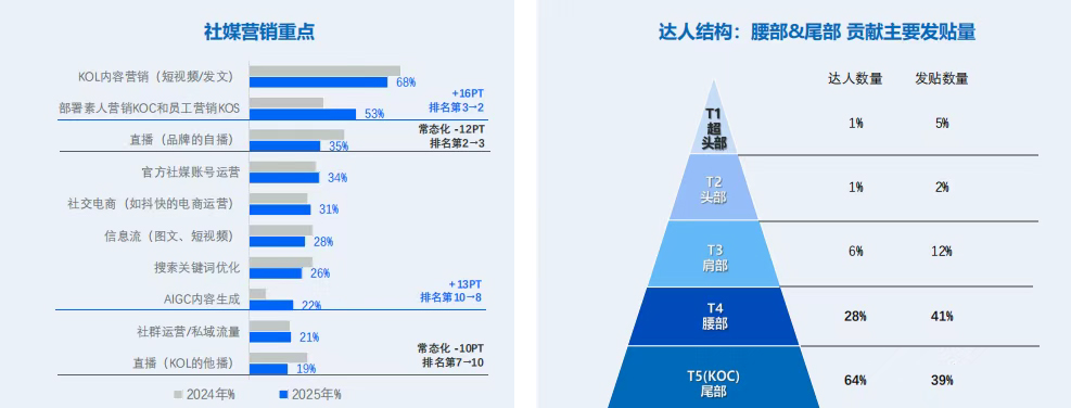· 素人營銷上位:“部署 KOC 與員工營銷 KOS” 躍升為社媒營銷重點工作的第 2 位(增長 16pt)。真實的人格背書比精美的官方物料更具穿透力。
