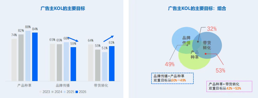 · 目標雙重奏:53% 的廣告主在 KOL 投放中追求 “產品種草 + 帶貨轉化” 的雙重目標,純品牌傳播的比例在下降。